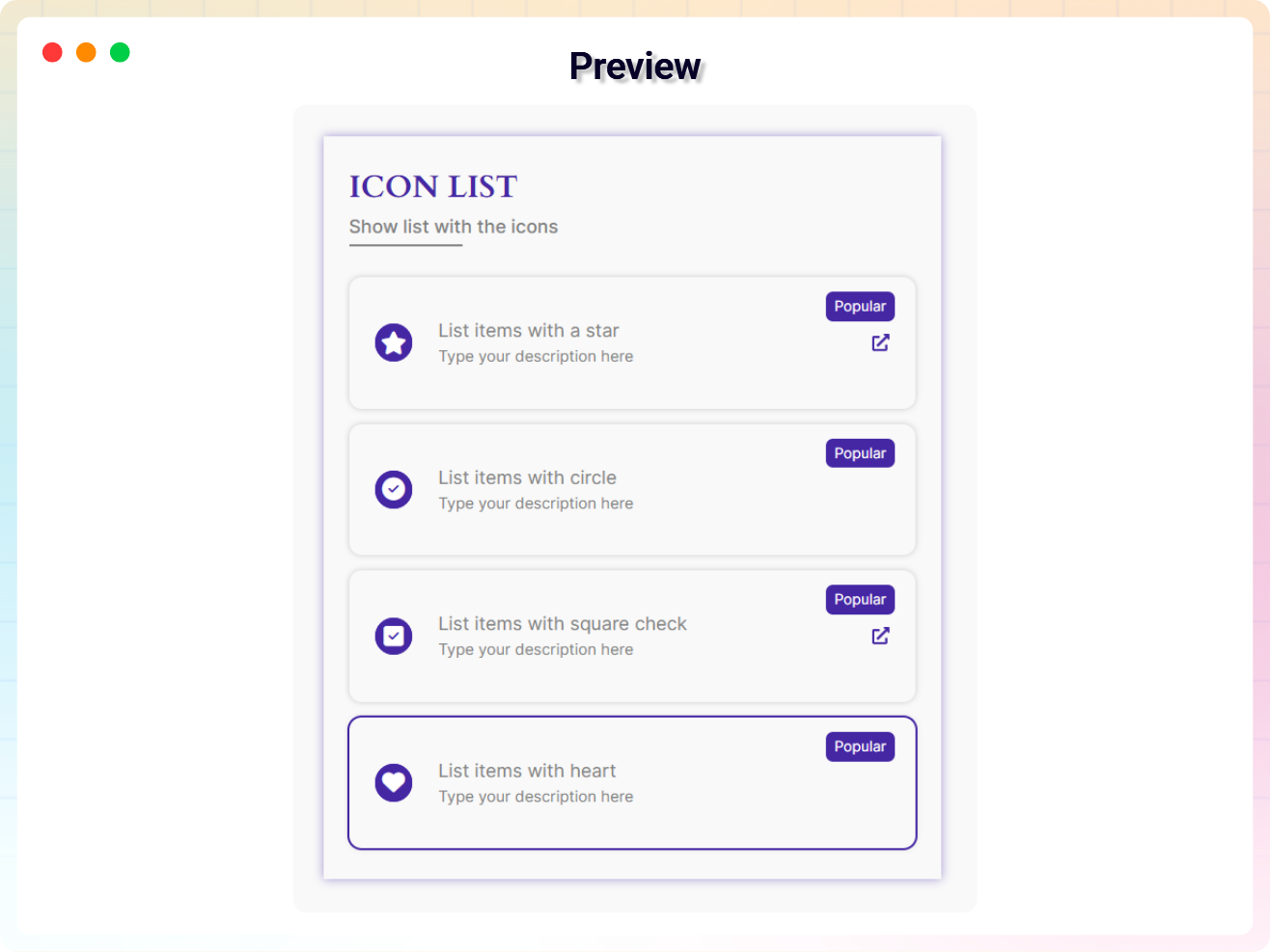 Pick from hundreds of built-in icons or upload your own custom images. Give each list item a unique visual element that enhances readability and brand recognition.